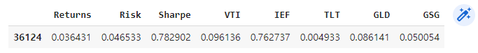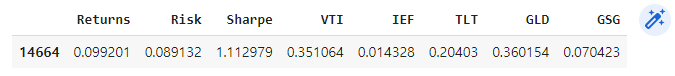 - 샤프지수가 가장 큰 데이터프레임의 행을 변수에 저장합니다.