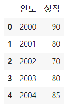 df = pd.DataFrame(data2, columns = ["연도", "성적"])