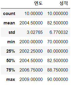 확인 결과 성적 데이터 개수는 10개이고, 평균은 82.5점, 표준편차는 약 6.77점, 최솟값은 70점, 중앙값은 82.5점, 최댓값은 90점임을 한눈에 볼 수 있습니다.