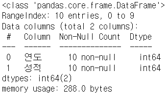 info 함수를 통해 데이터프레임의 정보를 확인할 수 있습니다.