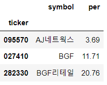 위의 예시는 per 데이터가 10 이상인 값의 행들을 추출한 것입니다.