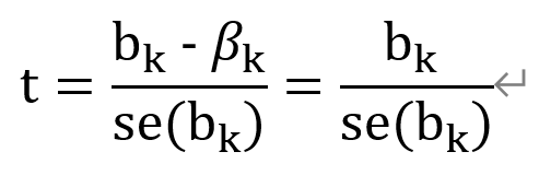 귀무가설이 "β2 = 0" 혹은 "β1 = 0"이기 때문에 βk는 지워집니다. t-값은 귀무가설이 참인 경우의 검정 통계량입니다.