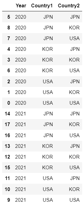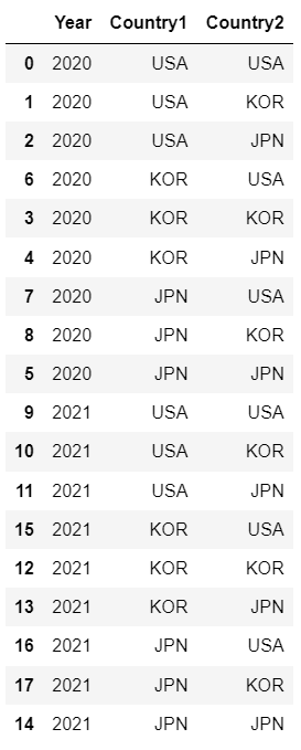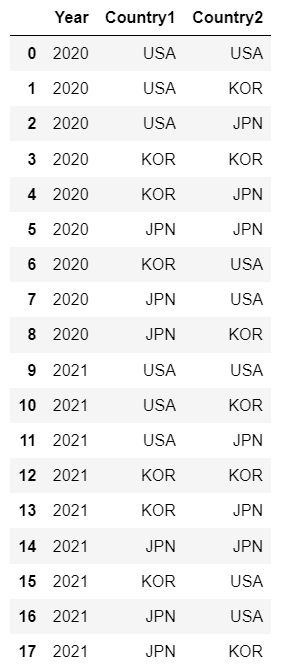 'Country1': ["USA", "USA", "USA", "KOR", "KOR", "JPN", "KOR", "JPN", "JPN", "USA", "USA", "USA", "KOR", "KOR", "JPN", "KOR", "JPN", "JPN"],